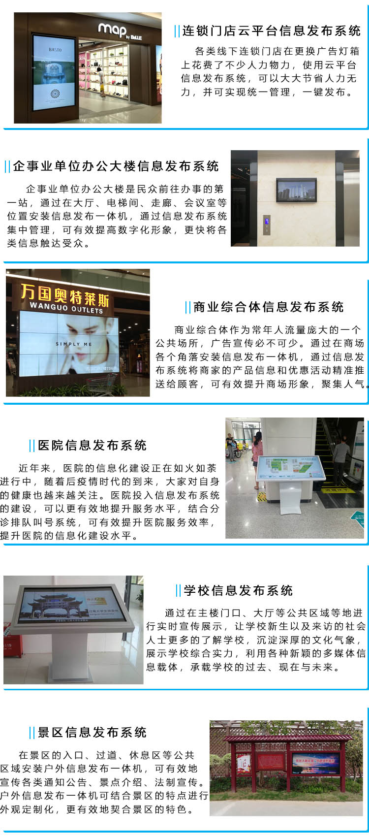 詳盡的終端配置信息,定時開關機,遠程更改視頻輸出類型及分辨率;統一實時監控;故障 及時告警,實時反饋當前播放內容及音量控制;終端程序更新可通過系統自動升級。