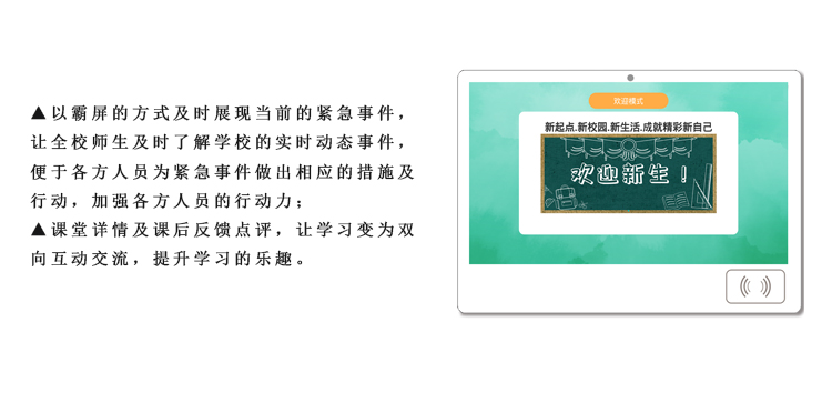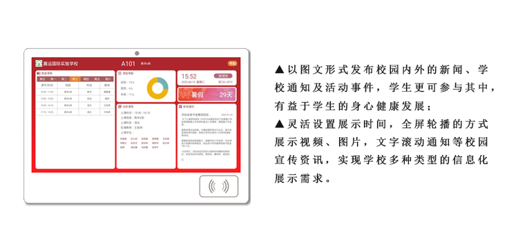 智慧班牌是智慧校園建設(shè)不斷發(fā)展的產(chǎn)物,是教育信息化改革的部分體現(xiàn)。它針對教改需求和學(xué)校使用場景的綜合考慮融合了教學(xué)需求的方方面面,加入了更多的實用功能,讓班牌更加靈活豐富。智慧班牌是以云平臺、云服務(wù)器為基礎(chǔ),采用區(qū)域?qū)嵤┕芾恚瑢崿F(xiàn)大數(shù)據(jù)、資源共享,有利于學(xué)校信息化建設(shè)和交流,也更易操作管理、數(shù)據(jù)更安全可靠,有效降低學(xué)校使用成本;平臺系統(tǒng)不斷優(yōu)化升級,版本升級云端控制,更貼合學(xué)校教育改革需求。